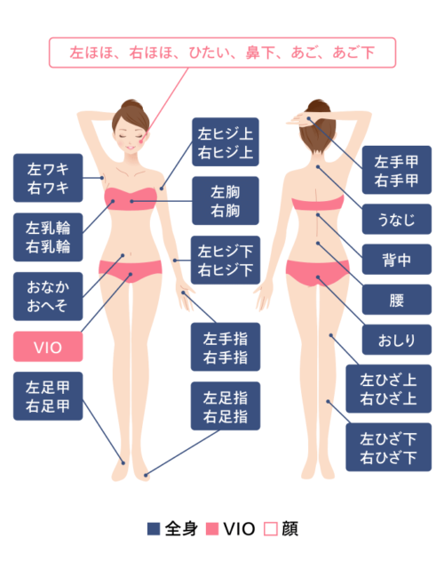 | 全身 | 左ワキ・右ワキ・左乳輪・右乳輪・おなか・おへそ・左ヒジ上・右ヒジ上・左胸・右胸・左ヒジ下・右ヒジ下・左手指・右手指・左手甲・右手甲・うなじ・背中・腰・おしり・左ひざ上・右ひざ上・左ひざ下・右ひざ下・左足指・右足指・左足甲・右足甲 |