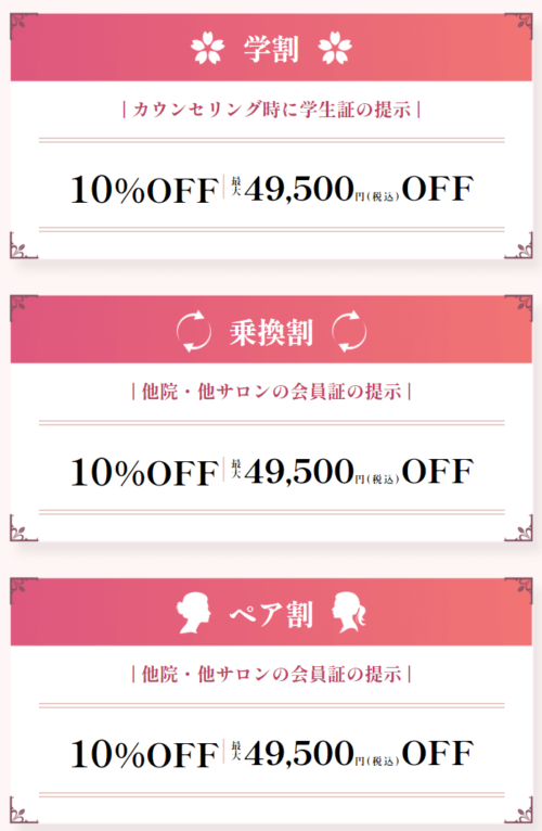 ブリリアスキンクリニックは、割引制度も豊富に揃っています。
