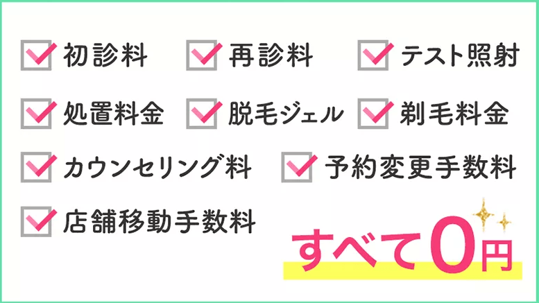 レジーナクリニックは診察料、シェービング代、麻酔、照射漏れをした場合の追加照射・アフターケア・解約料など、すべての追加費用が無料です。