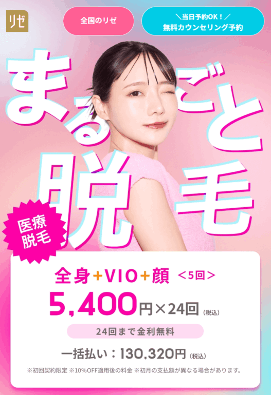 | 全身脱毛(全身28か所) | 216,000円(税込) / 5回 (月々3,300円) |