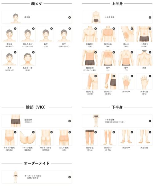 脱毛パーツごとに豊富なメニューが用意されているので、気になる部位のみをピックアップして施術を受けられますよ。
