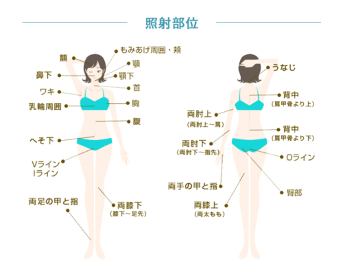 | 全身 | 胸・乳輪周囲・脇・腹・へそ下・背中・両肘上・両肘下・両手の甲と指・臀部・両膝上・両膝下・両足の甲と指 |