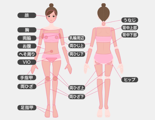 | 全身 | 胸・乳輪周辺・両脇・へそ周り・両ひじ上下・うなじ・背中上部下部・手指甲・両ひざ・両ひざ上下・ヒップ・足指甲 |